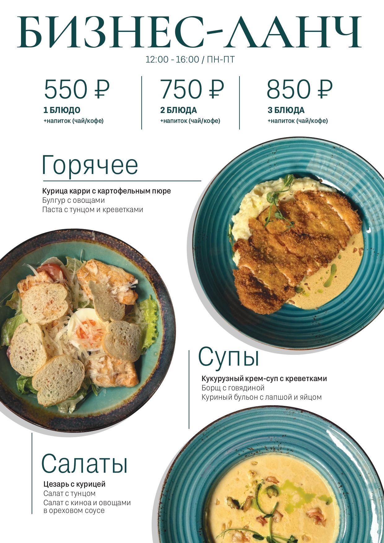 В составе набора — по одному блюду из каждой категории: супы, салаты и горячие блюда. На выбор доступны три варианта каждого, а также кофе или чай на ваш вкус.